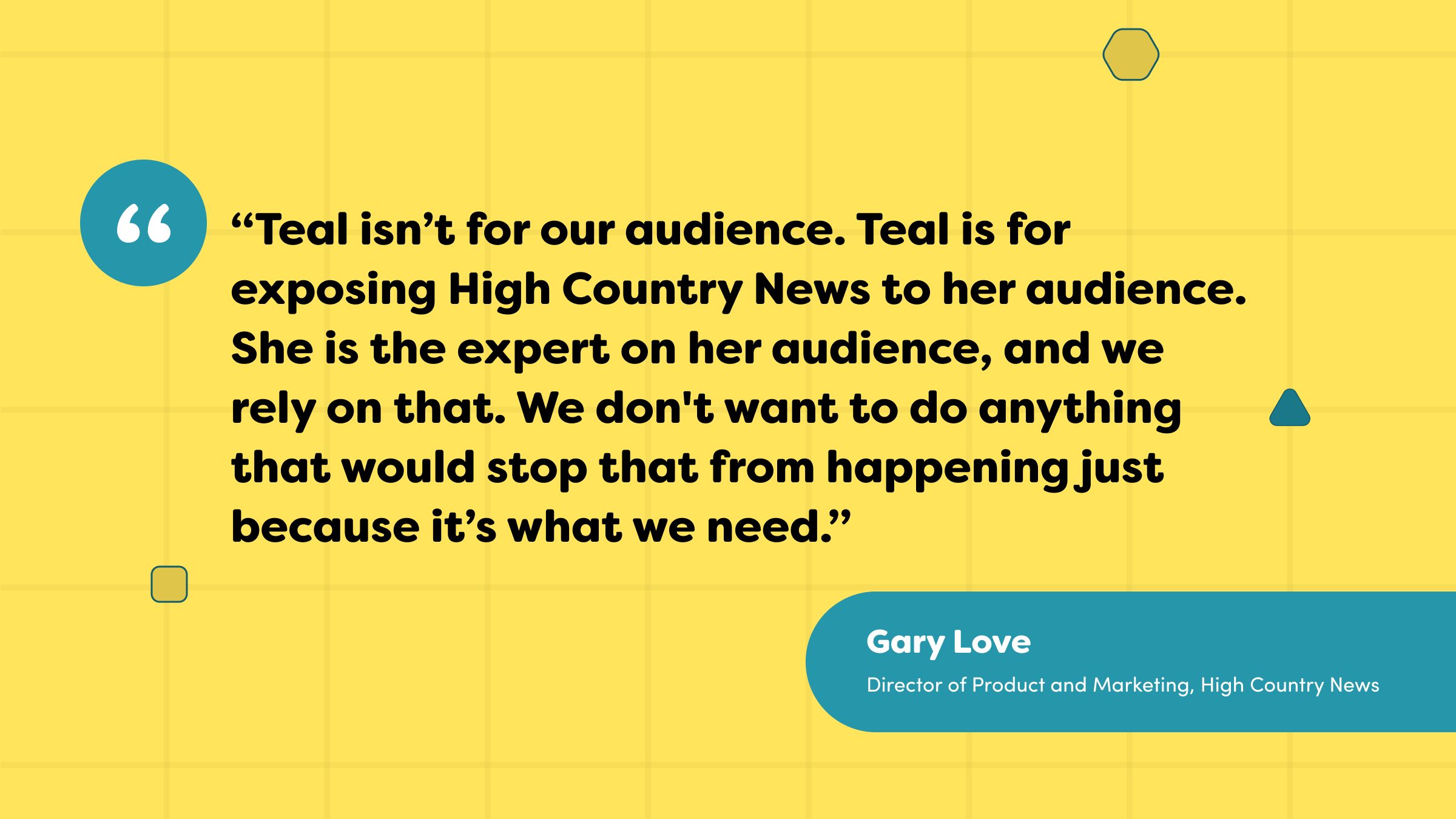 “Teal isn’t for our audience,” Love said. “Teal is for exposing High Country News to her audience. She is the expert on her audience, and we rely on that. We don't want to do anything that would stop that from happening just because it’s what we need.”