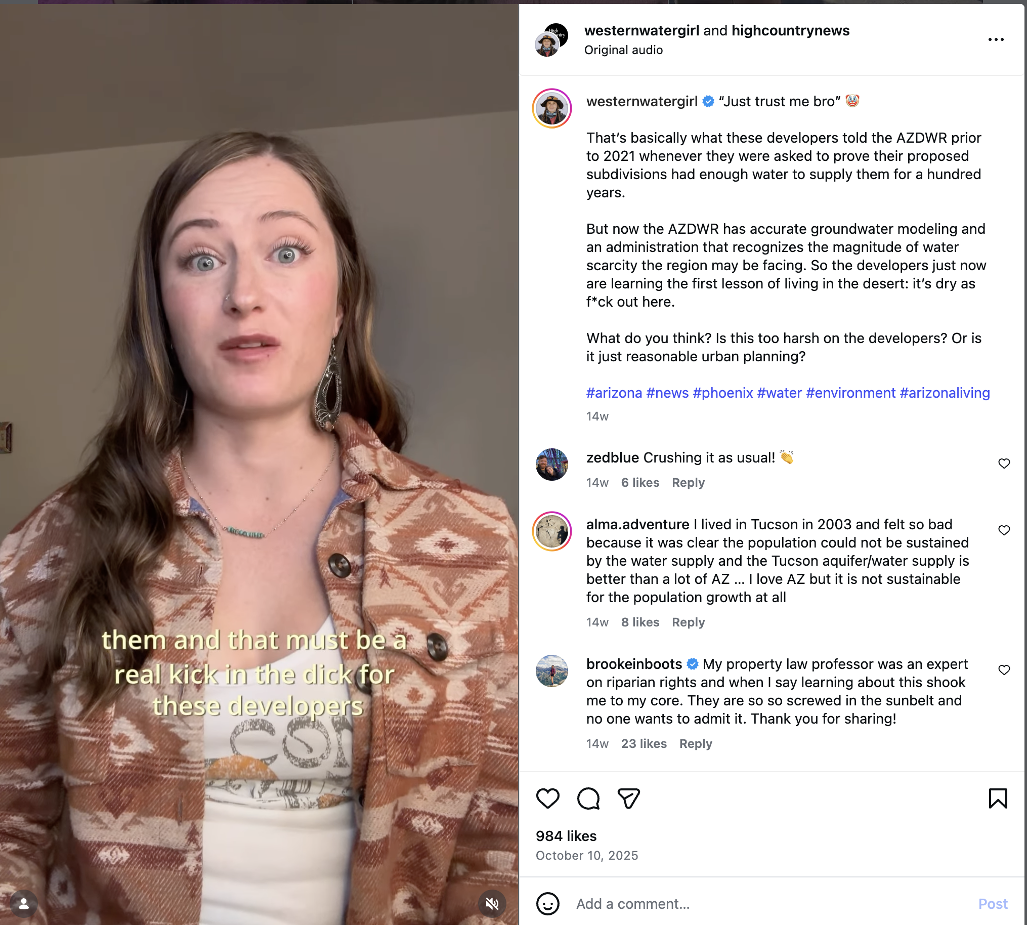 While she often emphasizes solution-driven content and good news, the style sometimes functions as rage bait, sparking strong emotional reactions that drive comments, shares, and debate. She also uses green-screen effects, question boxes, and captions to create community-driven content, respond to news, combat misinformation, and amplify High Country News’ reporting.