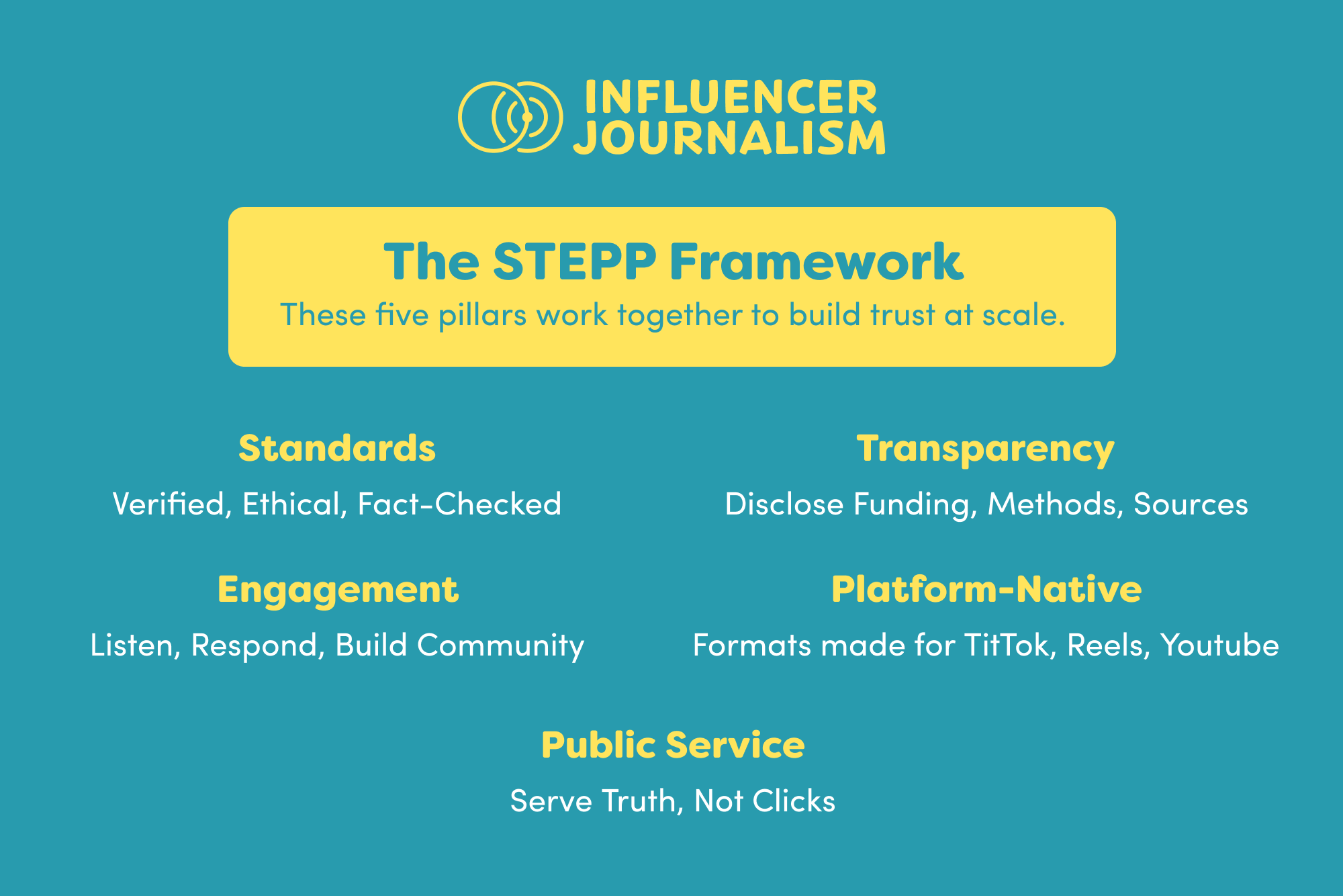 STEPP provides that framework. By grounding partnerships in Standards, Transparency, Engagement, Platform-Native content, and Public Service, newsrooms can navigate this emerging space with confidence building collaborations that serve both journalism’s mission and audiences’ evolving needs.
